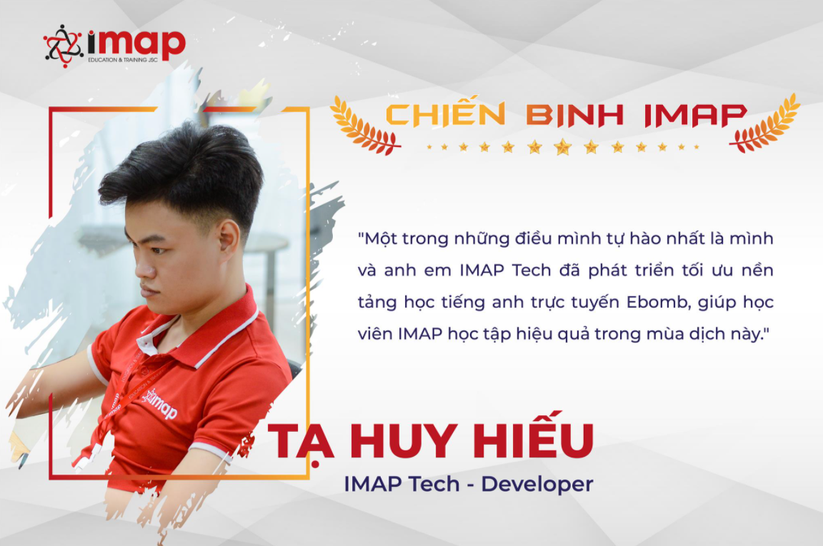 Là một trong những Developer đầu tiên đặt nền móng cho mảng công nghệ tại IMAP Việt Nam, phụ trách xây dựng nền tảng website các thương hiệu lớn như Anh Ngữ Ms Hoa, IELTS Fighter,... Mr Tạ Huy Hiếu - IMAP Tech đã nhận được nhiều điều trong suốt quá trình làm việc tại công ty, đặc biệt hơn trong tình hình mùa dịch này.