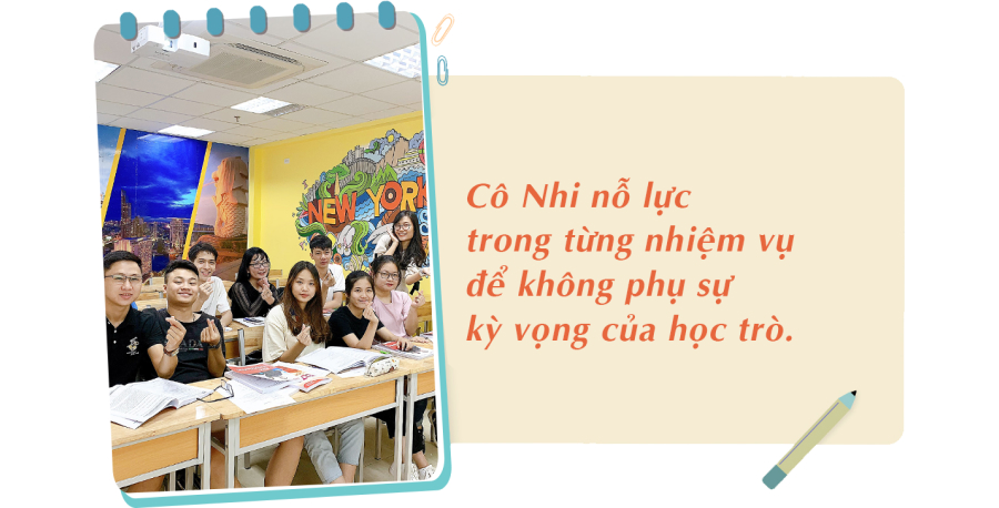 Đặc biệt, khi tìm được những điều thú vị, mới mẻ thì cô sẽ chia sẻ ngay với học trò, biến những trải nghiệm cá nhân thành chất liệu đan xen trong bài giảng mang tính chất tham khảo và giáo dục. Như vậy, các bạn học viên đến lớp không chỉ để khám phá tiếng Anh mà còn để lắng nghe, chia sẻ với những người bạn đồng hành, trong đó có cô giáo Yến Nhi.