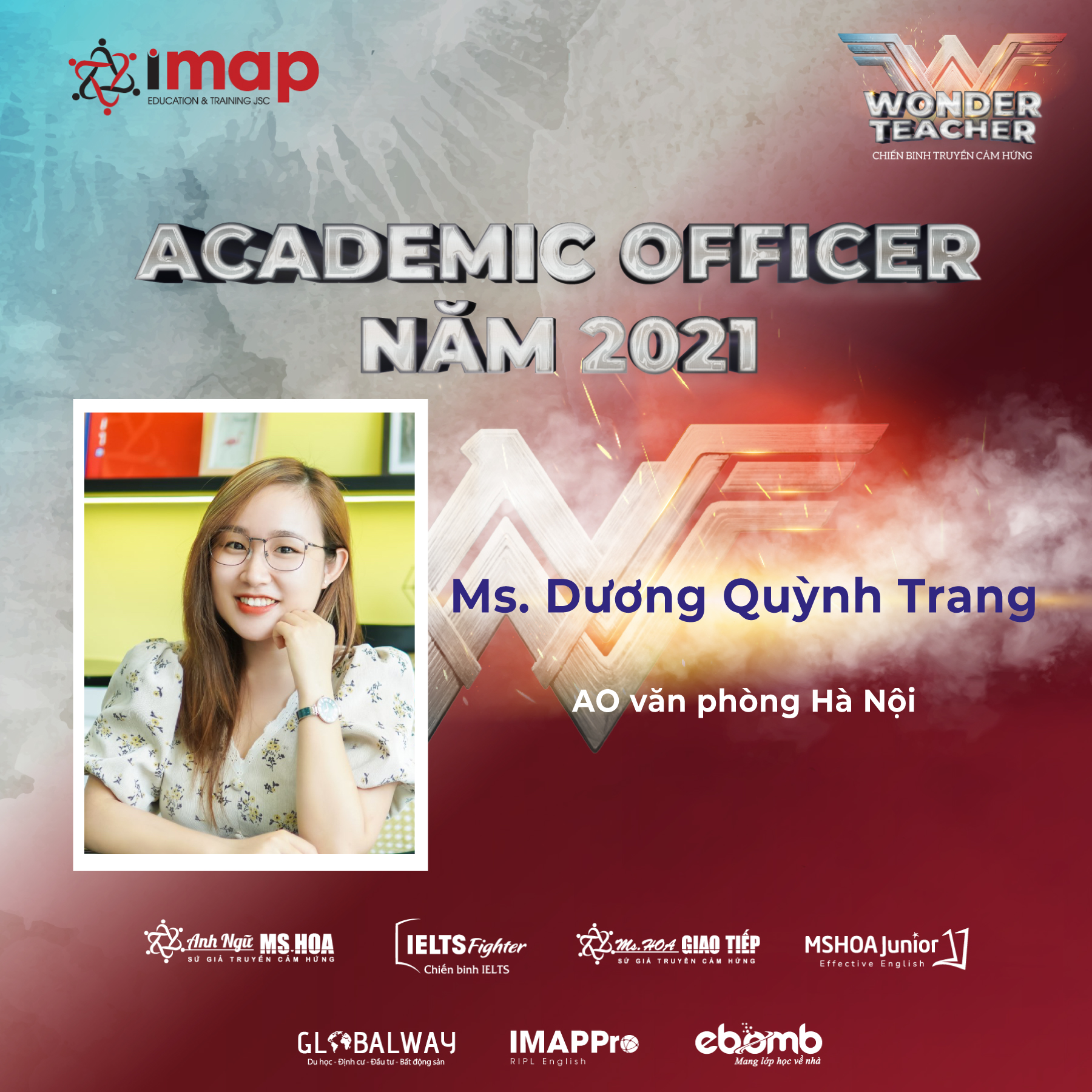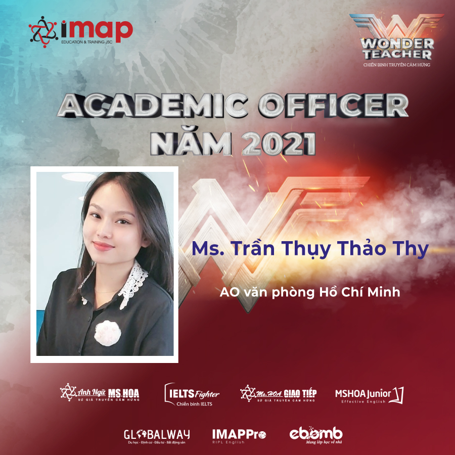 Đằng sau những thầy cô giáo luôn tràn đầy năng lượng trên lớp học, chúng ta không thể quên những cộng sự đồng hành, hỗ trợ giáo viên mỗi khi cần. Từ cách soạn giáo án, tương tác với học viên,.. đó chính là Academic Officer - Chuyên viên đào tạo học thuật đến từ Phòng Đào tạo. IMAP xin chúc mừng những AO đã đạt danh hiệu "ACADEMIC OFFICER CỦA NĂM 2021"