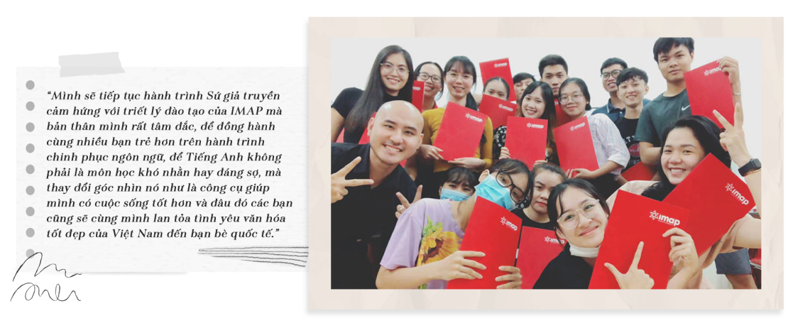 Từ những ngày mới tìm hiểu về IMAP, thầy Sang nhận thấy đây là một môi trường xây dựng và nuôi dưỡng người giáo viên không đơn thuần là giáo viên, mà IMAP gọi họ là những “sứ giả truyền cảm hứng”, đấy là điều làm cho thầy Sang rất ấn tượng. “Quá trình học và nghiên cứu của một người học như mình cũng nhận thấy cực rõ, điều quan trọng nhất của một người giáo viên đó là có thể truyền cảm hứng cho các bạn học viên khám phá kiến thức, vì một người thầy không thể mãi mãi dạy học viên kiến thức, nên tự học với niềm cảm hứng được thôi thúc sẽ luôn là điều tốt nhất dành cho mỗi học viên. Chính ấn tượng này đã hút mình vào với hành trình sứ giả truyền cảm ứng tại IMAP.