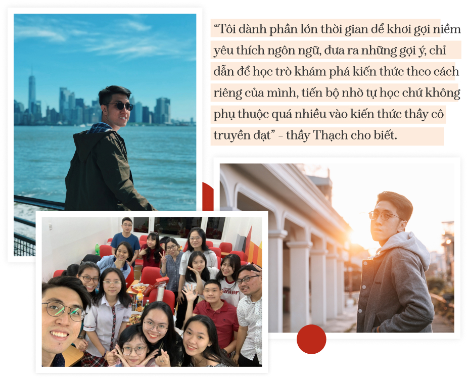 Ngoài việc tập trung nâng cao chuyên môn, thầy Thạch cũng chú trọng tới việc trải nghiệm ở nhiều khía cạnh trong cuộc sống để nhào nặn nên những chất liệu đời thường, đưa vào bài giảng, giúp học trò vừa lĩnh hội được kiến thức tiếng Anh vừa tham khảo thêm nhiều bài học trong cuộc sống. Theo thầy Thạch, người giáo viên không chỉ là người dạy học, truyền đạt kiến thức mà còn là người đưa ra định hướng, dẫn dắt học trò đi tìm thế mạnh của mình, hoàn thiện bản thân từng ngày.