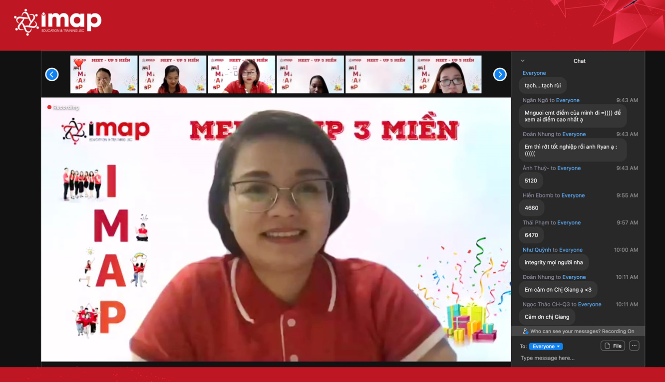 Tuyên thệ, gặp mặt đầu tuần là những văn hóa bạn sẽ được trải nghiệm khi làm việc tại IMAP. Vào thứ Hai đầu tuần, toàn bộ các chi nhánh văn phòng, cơ sở của IMAP Việt Nam trên cả nước sẽ cùng tổ chức Tuyên thệ, gặp mặt và giao lưu giữa các phòng ban. Tháng 8 này, theo Chỉ thị 16 của Thủ tướng chính phủ, IMAP tuân thủ quy định về Chế độ work from home - Làm việc tại nhà cùng các tổ chức, doanh nghiệp trên cả nước. Chính vì vậy, các buổi sáng Tuyên thệ đầu tuần tập trung đã được chuyển sang Online trên nền tảng Zoom.